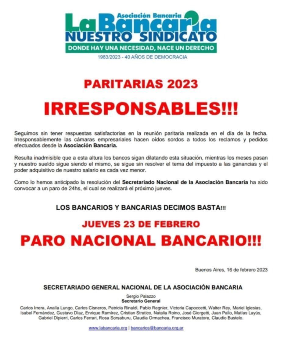 La Asociación Bancaria anunció que realizará un paro nacional por 24 horas el próximo jueves 23 de febrero. El gremio que conduce Sergio Palazzo apuntó contra las cámaras empresariales tras no llegar a un acuerdo en la reunión paritaria de este mediodía. "Hacen oídos sordos a todos los reclamos y pedidos efectuados", señalaron.