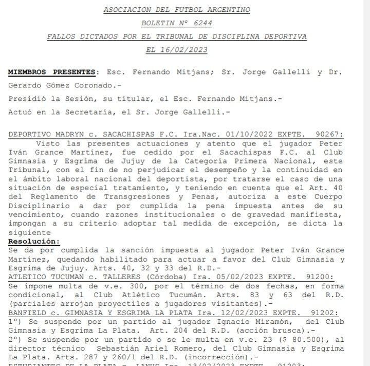 En el Boletín Oficial de la jornada de este viernes, desde la LPF confirmaron que la sanción a Miramón es por haber protagonizado una "acción brusca", a partir de la cual se le otorgó una fecha de suspensión. Es decir, que no podrá jugar frente a Instituto en el Bosque, aunque podrá regresar al mediocampo cuando le toque visitar a Barracas Central.