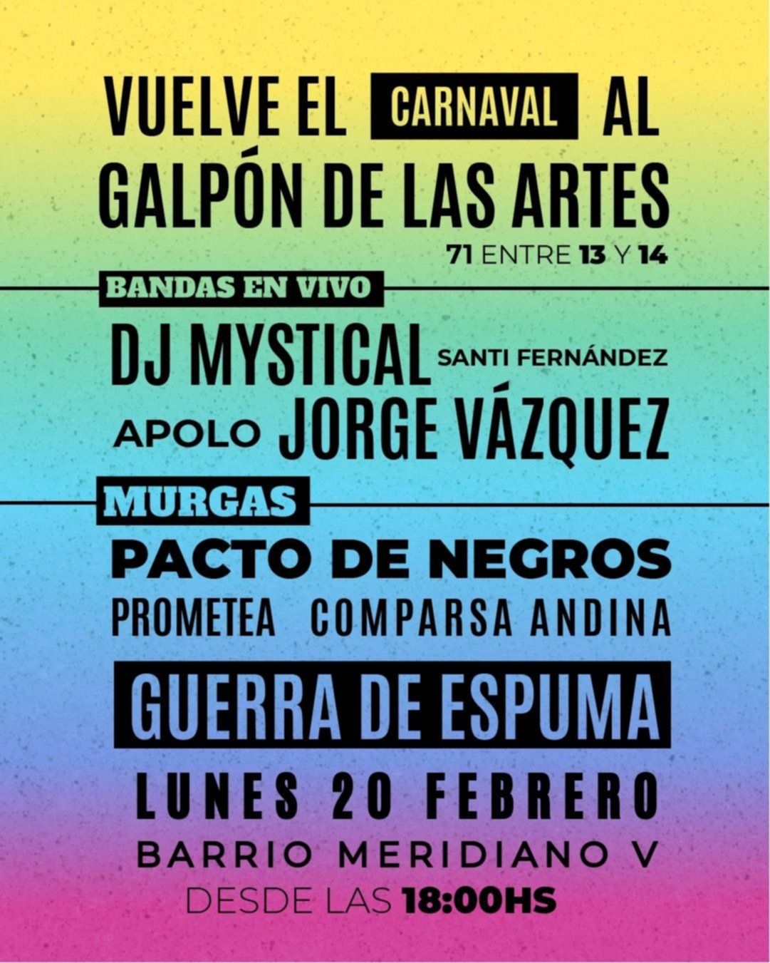 El fin de semana largo está a la vuelta de la esquina y mientras se ultiman los detalles de lo que será el festejo de carnaval a pura fiesta, los responsables del Galpón de las Artes confirmaron que el próximo lunes la tradicional celebración en el barrio Meridiano V volverá a realizarse con varios shows musicales y la presentación de destacadas murgas, todo con entrada libre y gratuita.