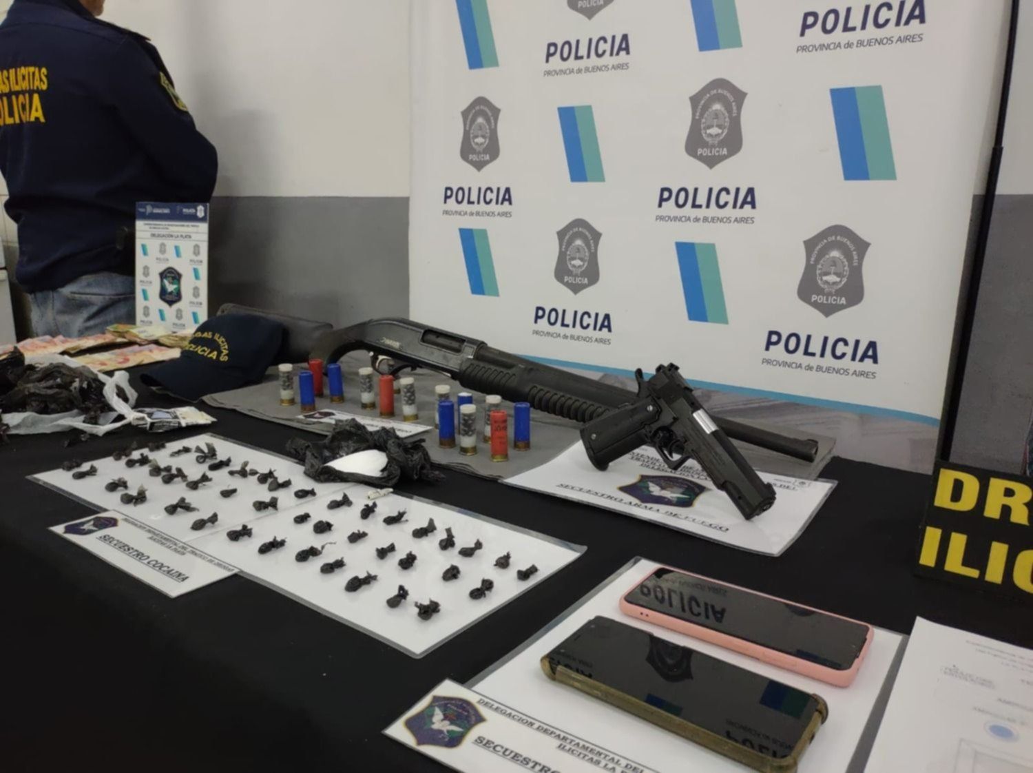 Como resultado de los allanamientos domiciliarios se procedió a secuestrar 44 envoltorios de nylon y un bochón de nylon, todos ellos conteniendo cocaína valuada en $350.000, una escopeta marca Hawk Modelo PA-001 calibre 12 nro. 11025, siete cartuchos posta de guerra de escopeta calibre 12, siete cartuchos posta de goma de escopeta calibre 12, una réplica de pistola calibre 9mm, $ 3540 pesos en billetes de diferentes denominaciones, dos teléfonos celulares y más recortes de nylon.