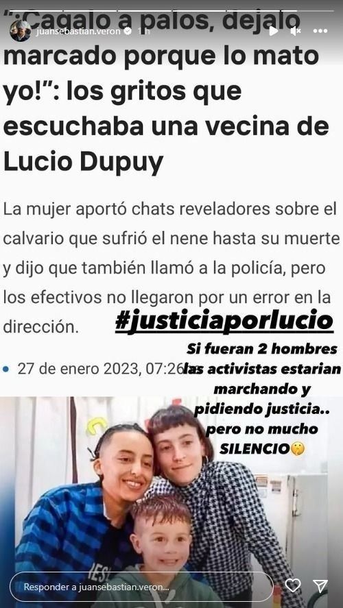 Cabe recordar que Verón ya se había referido anteriormente a lo sucedido con Lucio y había apuntando contra el movimiento feminista. "Si fueran dos hombres, las activistas estarían marchando y pidiendo justicia…pero no, mucho silencio", escribió la Brujita sin ningún filtro. Posteriormente, compartió un video en el que se relata cómo las dos presuntas asesinas del pequeño intentaron ocultar lo que sucedió. Esto provocó un sin fin de reacciones de apoyo y de rechazo a la postura del ídolo del Pincha.