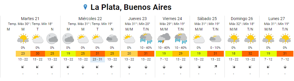 Respecto a las temperaturas que se avecinan, el SMN pronostica al menos 30 grados de máxima para toda la semana y mínimas que no bajarán de los 18°C. Al mismo tiempo se esperan chaparrones para el jueves y viernes.