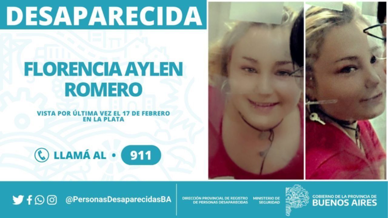 Florencia Aylén Romero desapareció de una clínica de La Plata y su familia vive momentos de gran angustia y preocupación. La joven de 25 años fue vista por última vez el pasado 17 de febrero en nuestra ciudad y sus seres queridos piden ayuda para encontrarla. Este miércoles el gobierno bonarense se sumó a la campaña desde el área de Personas Desaparecidas.