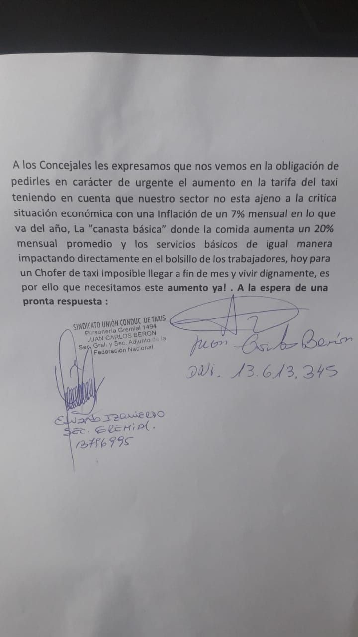 Por último, remarcaron: “A los Concejales les expresamos que nos vemos en la obligación de pedirles en carácter urgente el aumento en la tarifa del taxi, teniendo en cuenta que nuestro sector no está ajeno a la crítica situación económica con una inflación de un 7% mensual en lo que va del año. La “canasta básica” donde la comida aumenta un 20% mensual promedio y los servicios básicos de igual manera impactando directamente en el bolsillo de los trabajadores, hoy para un chofer de taxi es imposible llegar a fin de mes y vivir dignamente, es por ello que necesitamos este aumento ya. A la espera de una pronta respuesta”, concluyeron.