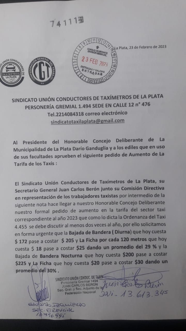 “El sindicato Unión Conductores de Taxímetros de La Plata, su Secretario General Juan Carlos Berón junto su Comisión Directiva en representación de los trabajadores taxistas por intermedio de la siguiente nota hace llegar a nuestro Honorable Concejo Deliberante nuestro formal pedido de aumento en la tarifa del sector taxi correspondiente al año 2023 que, como lo dicta la Ordenanza del Taxi 4.455, se debe discutir al menos dos veces al año”, precisaron en el comunicado.