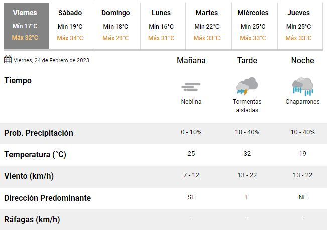 Será la previa de un fin de semana con buen tiempo, nubosidad en disminución y temperaturas de 34°C el sábado -también con posibilidades de precipitaciones por la tarde- y 29°C el domingo.