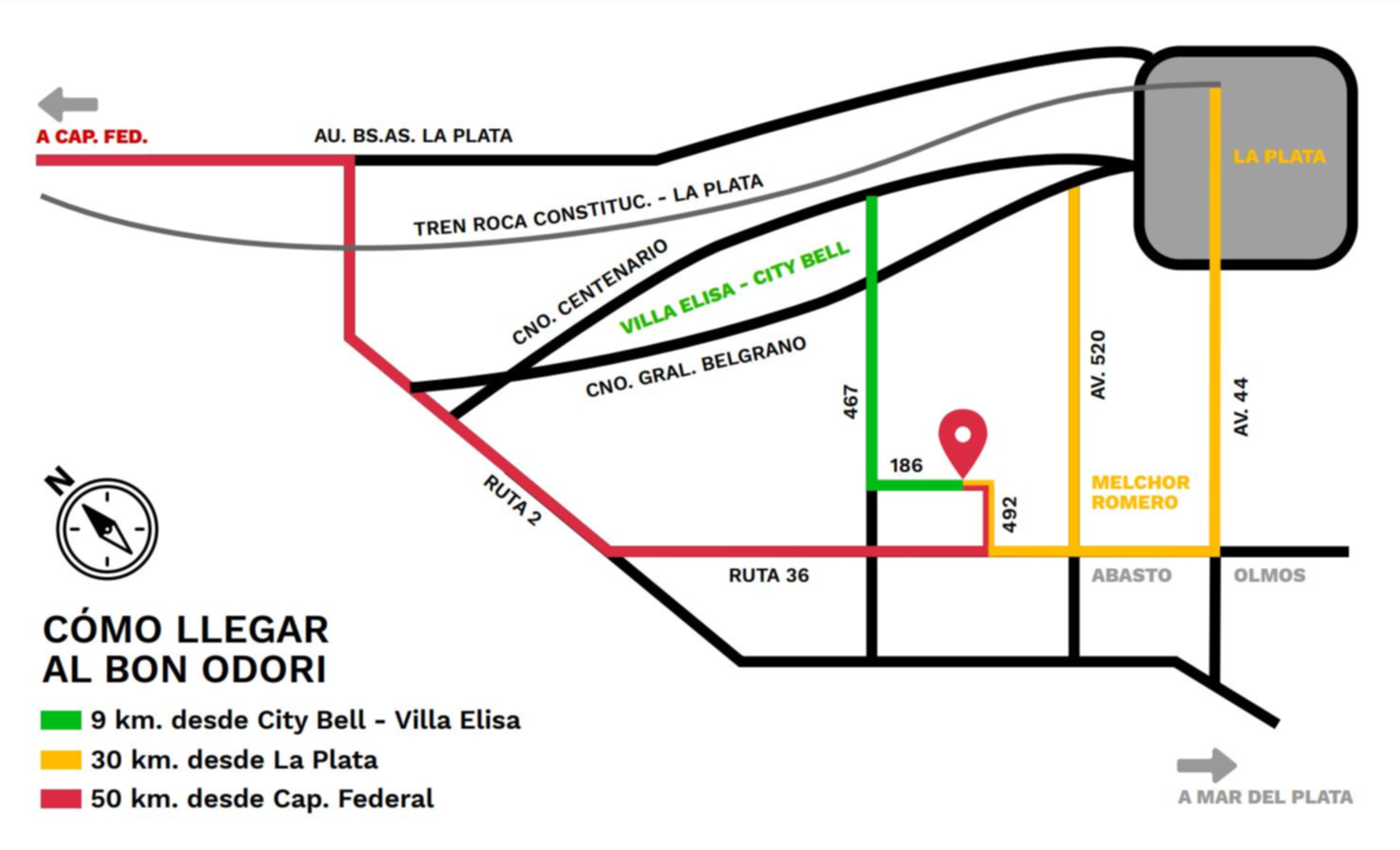 Desde City Bell / Villa Elisa y alrededores: tomar calle 467 (ex 11), pasar por country Grand Bell, hacer aprox. 4km. A partir de la calle 178 el camino hacia el predio estará señalizado.