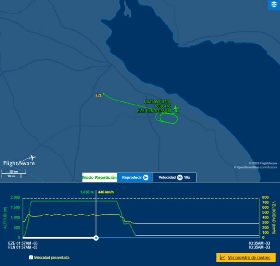 Según consta en el registro realizado por el sitio FlightRadar, especializado en el seguimiento en tiempo real de todos los vuelos alrededor del mundo, la aeronave dio cuatro vueltas sobre La Plata a una altura promedio de unos 6 mil pies o, lo que es lo mismo, poco más de 1.800 metros y finalmente regresó al aeropuerto de origen, desde donde fue reprogramado y luego partió, ya sin contratiempos, hacia el destino previsto originalmente.