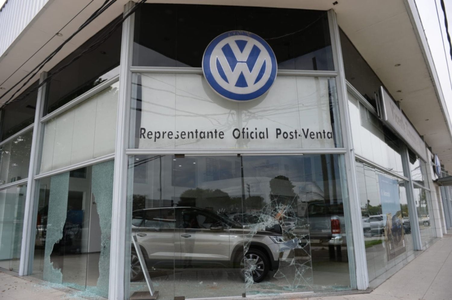 Los asaltantes arrojaron trozos de concreto que quedaron desparramados en el interior del local que comercializa vehículos Volkswagen. Los investigadores analizan por estas horas las cámaras de seguridad de la zona para intentar perseguir a los atacantes, que escaparon tras realizar los destrozos.