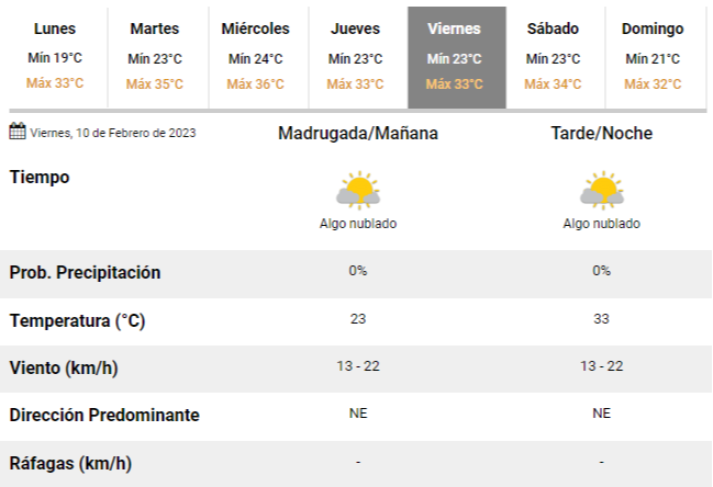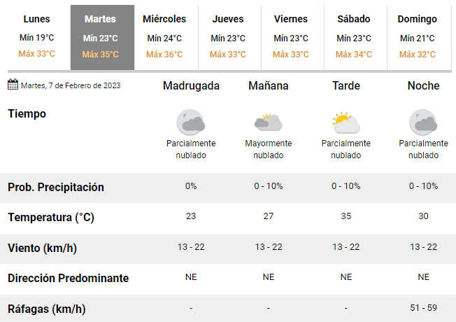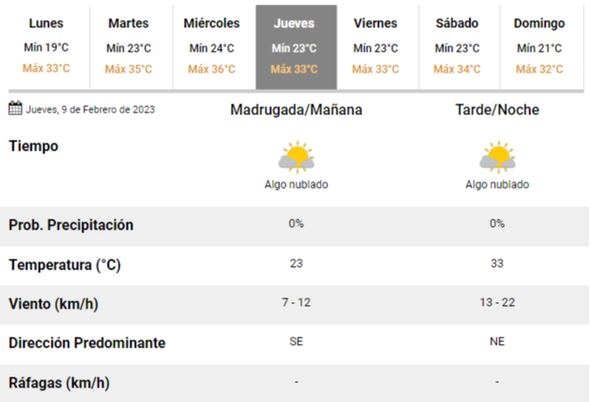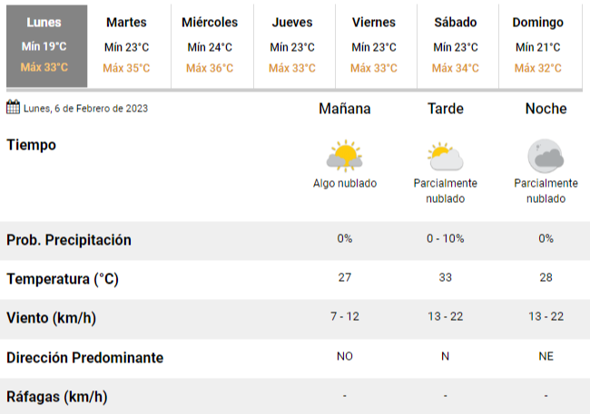 De acuerdo con los especialistas, la primera jornada de la semana transcurrirá con cielo algo a parcialmente nublado, vientos leves a moderados soplando mayormente desde el norte y una temperatura oscilando entre 19 y 33°C.