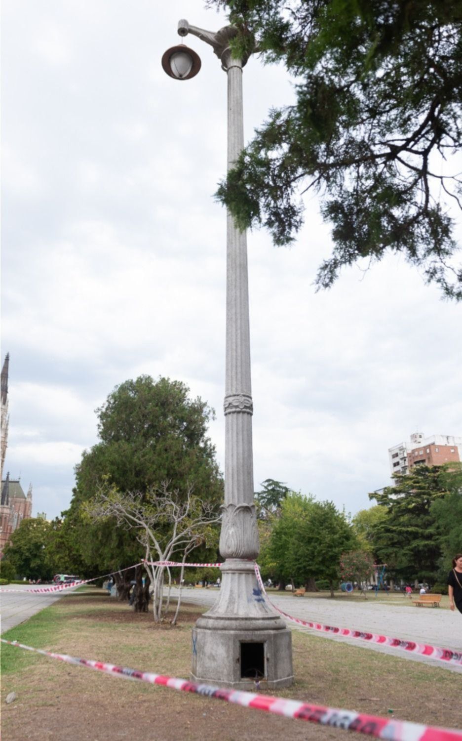 Una de las columnas de Plaza Moreno amaneció cercada por una cinta de peligro y generó preocupación entre los vecinos que transitaban por el lugar. Tal fue el temor que despertó el vallado, que algunos decidieron evitar el sector y caminar lejos para no correr riesgos ante un posible derrumbe.