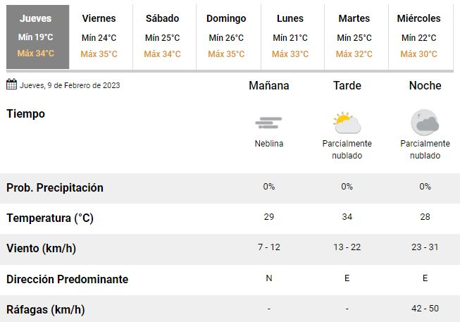 Según el SMN, para esta jornada se espera una máxima de 34°C, cielo parcialmente nublado y 99% de humedad.