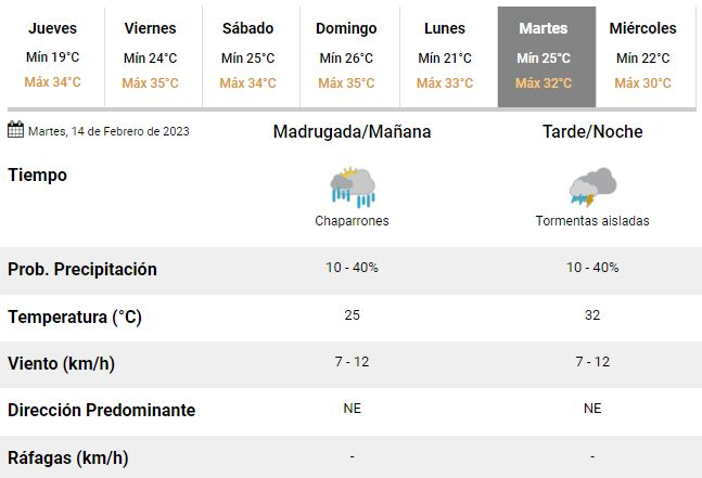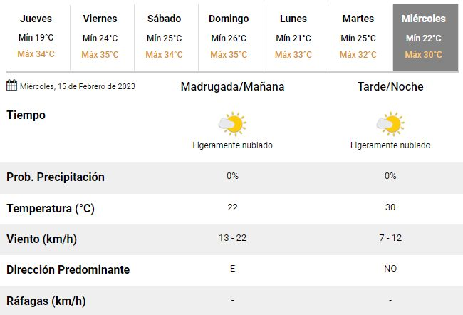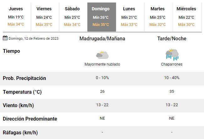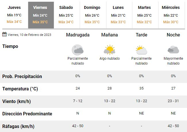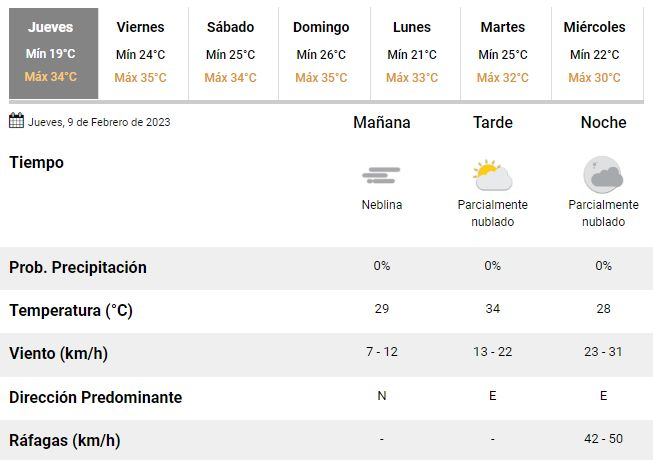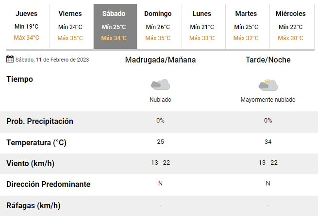 El pronóstico del organismo indica que este jueves la temperatura oscilará entre 19 y 34°C, prevé máximas de 35°C para el viernes y predice picos de 34 y 35°C a lo largo de los próximos sábado y domingo, respectivamente.