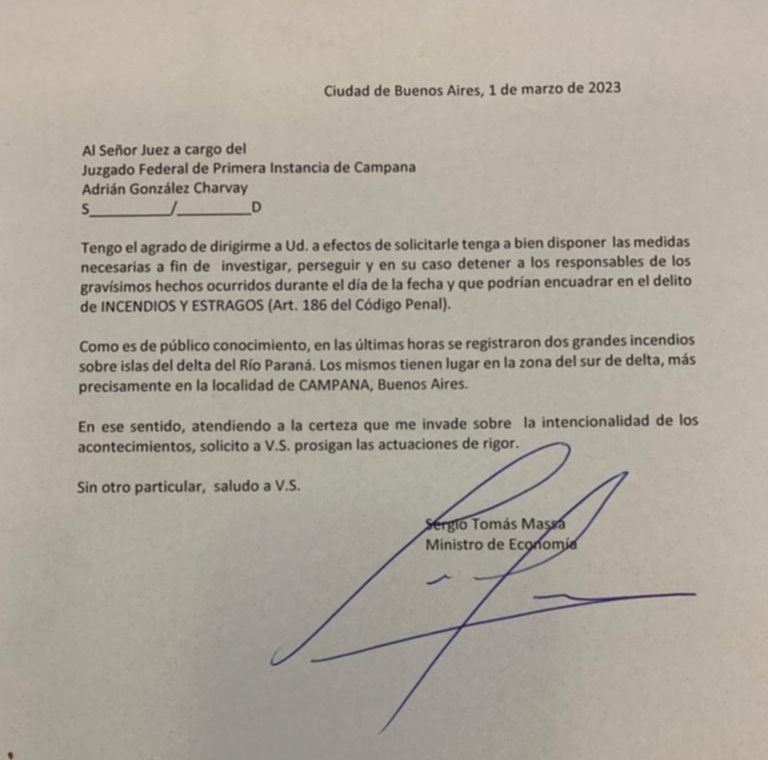 "Como es de público conocimiento, en las últimas horas se registraron dos grandes incendios sobre islas del delta del Río Paraná. Los mismos tienen lugar en la zona del sur de delta, más precisamente en la localidad de Campana. En ese sentido, atendiendo a la certeza que me invade sobre la intencionalidad de los acontecimientos, solicito a V.S. prosigan las actuaciones de rigor", cierra.