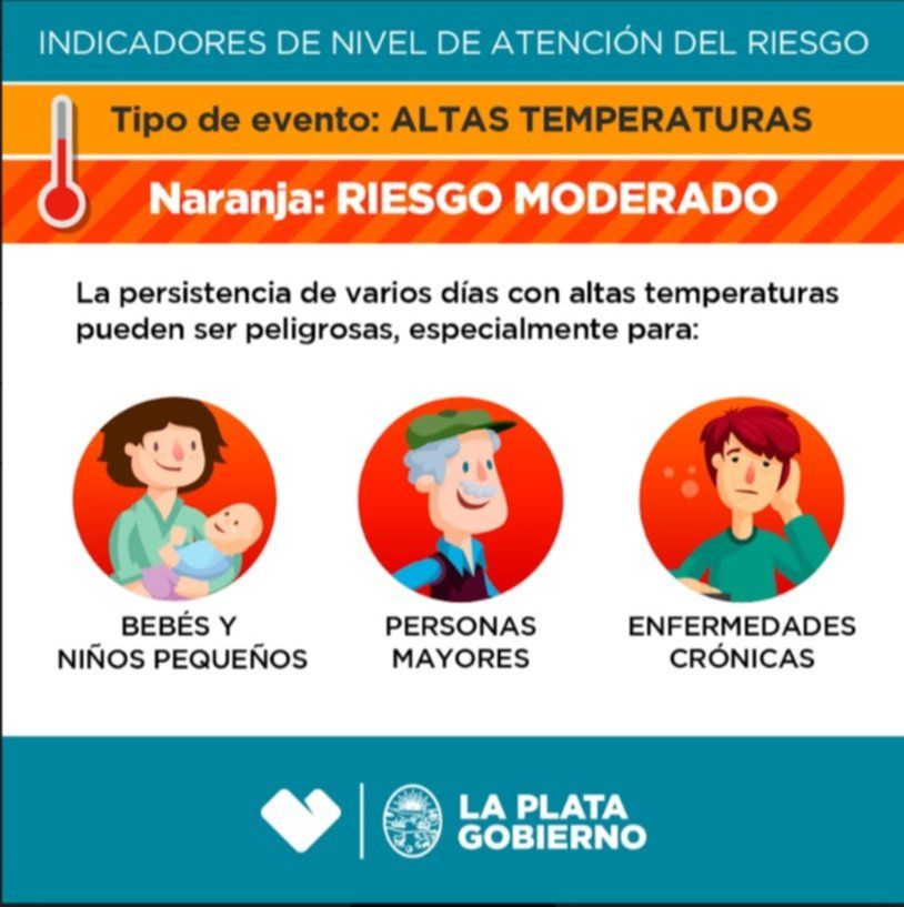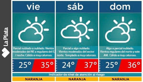 "En La Plata, amanece cálido, parcialmente nublado con el Nivel de Atención al Riesgo Naranja, por altas temperaturas", indicaron los meteorólogos de la Comuna al respecto y adelantaron además que "el calor persistirá en ascenso el fin de semana".