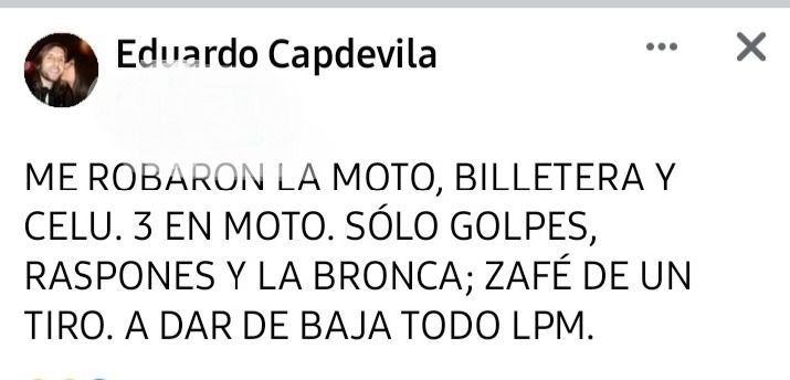 Capdevila contó en sus redes que fue asaltado por tres hombres que le robaron su moto, dinero y documentos. Además, aseguró que estuvo al borde de sufrir un disparo, pero que salió ileso de la escena, aunque con algunos golpes y raspones.