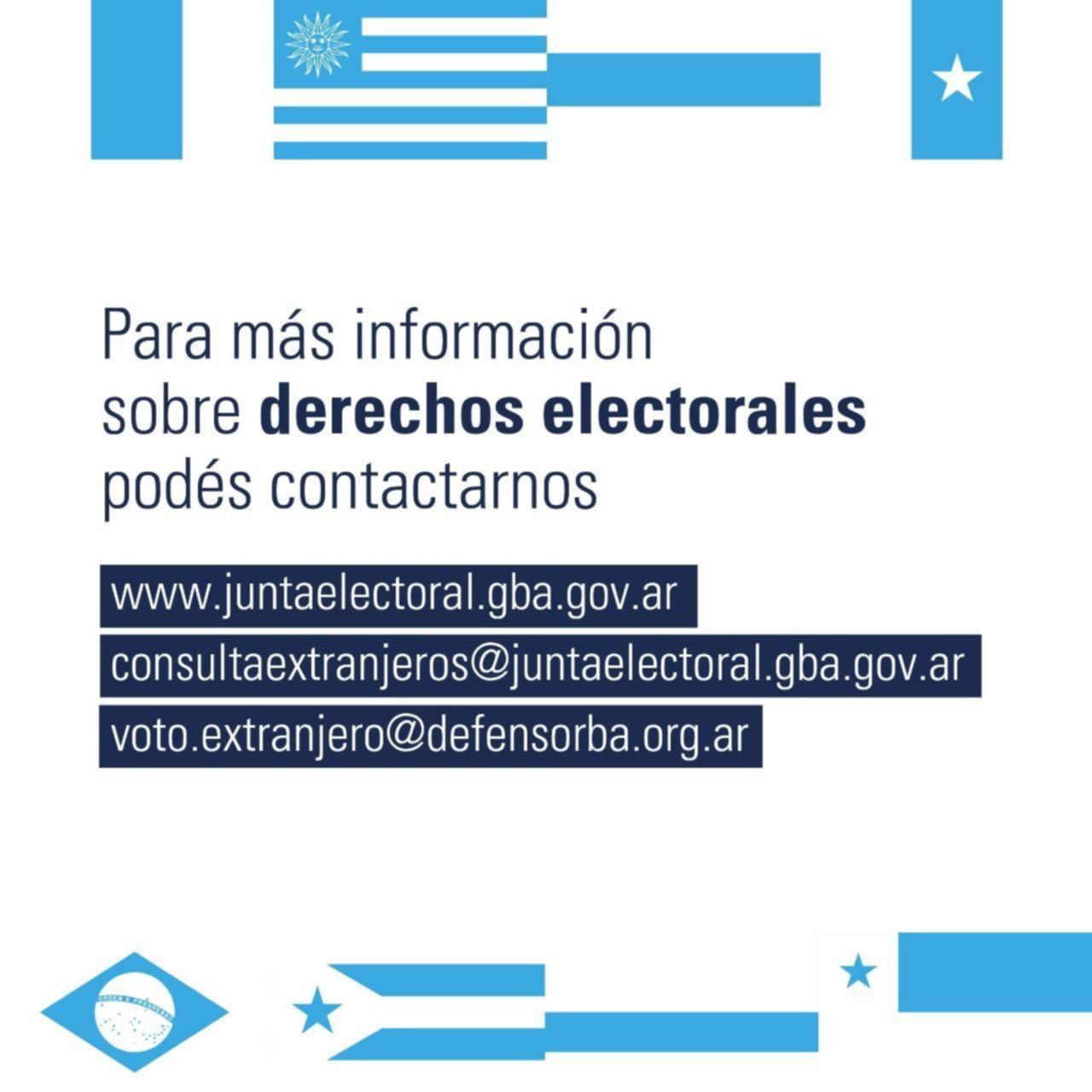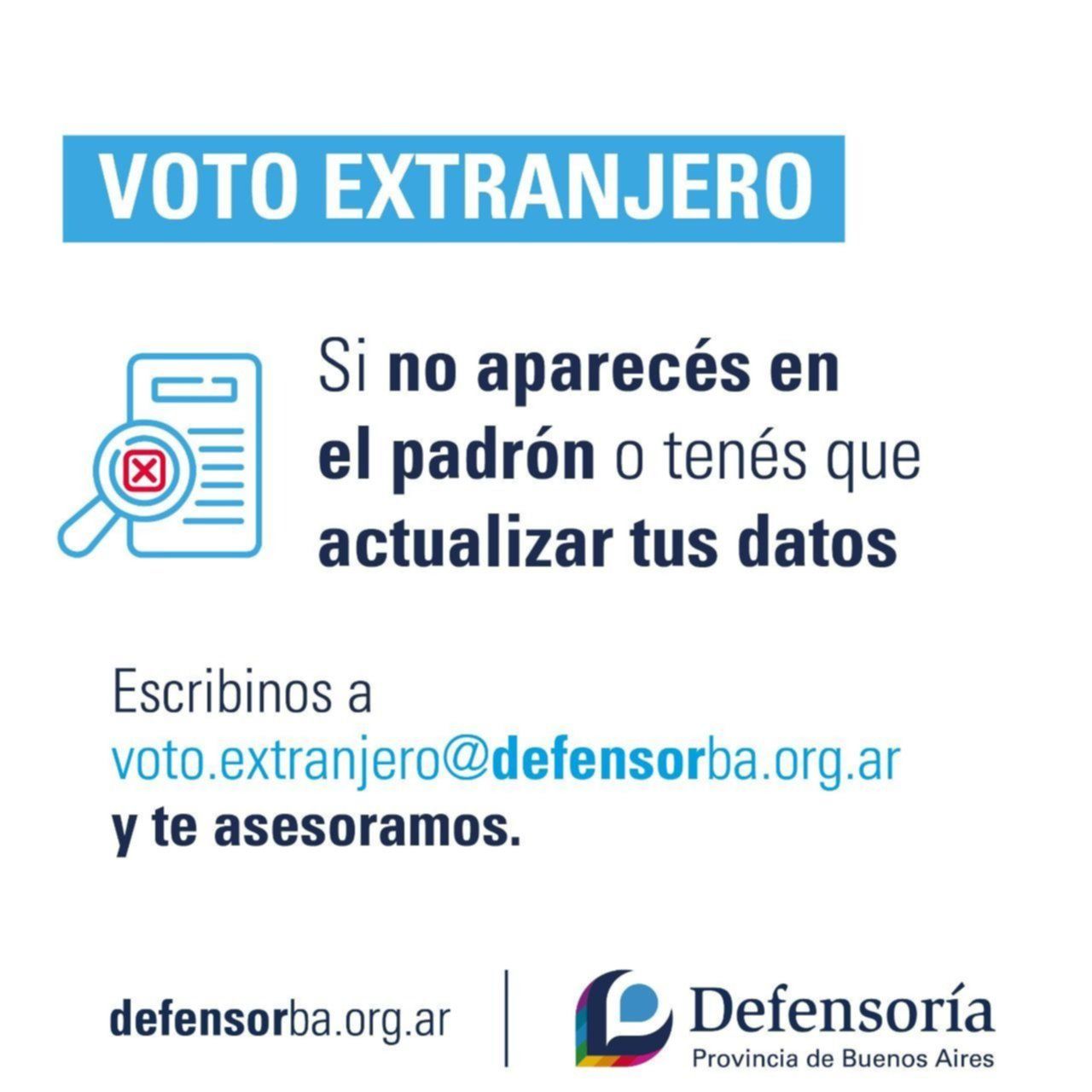 Para más información sobre derechos electorales se puede escribir a: consultaextranjeros@juntaelectoral.gba.gov.ar y a voto.extranjero@defensorba.org.ar.