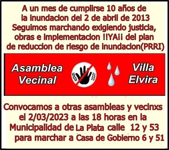 En esta oportunidad, la actividad es convocada por la Asamblea Vecinal de Villa Elvira, que también llamó a otras organizaciones a sumarse a la propuesta; y se trata de una marcha desde la Municipalidad de La Plata hasta la Gobernación bonaerense, que arrancará a las 18.