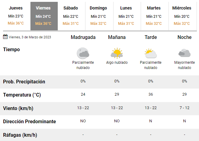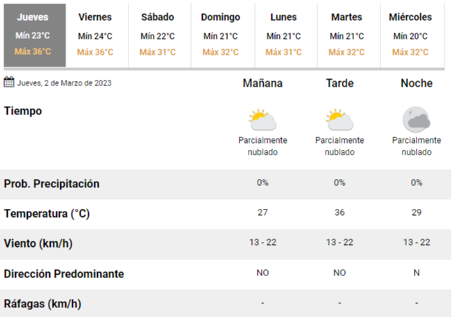 El jueves amaneció templado y con una mínima de 23°C, pero los especialistas del Servicio Meteorológico Nacional (SMN) pronostican una tarde de muchísimo calor y una temperatura en franco ascenso, pudiendo alcanzar hasta 36°C pasado el mediodía.