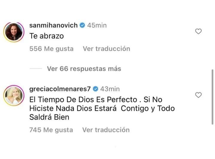 Mientras que la actriz Grecia Colmenares le escribió "El tiempo de Dios es perfecto. Si no hiciste nada, Dios estará contigo y todo saldrá bien".