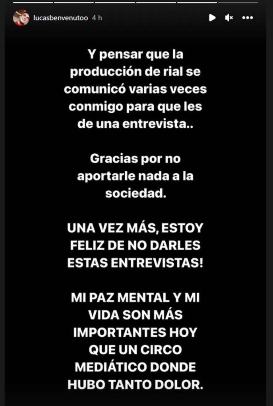 "Y pensar que la producción de Rial se comunicó conmigo para que les de una entrevista. Gracias por no aportar nada a la sociedad", remarcó. "Una vez más, estoy feliz de no darles estas entrevistas. Mi paz mental y mi vida son lo más importante hoy, que un circo mediático donde hubo tanto dolor", concluyó Benvenuto.