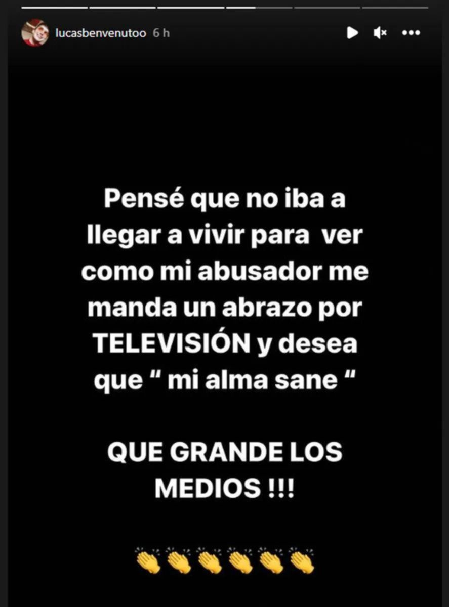 El joven continuó su descargo y manifestó "Pensé que no iba a llegar a vivir para ver como mi abusador me manda un abrazo por televisión y desea que "mi alma sane".