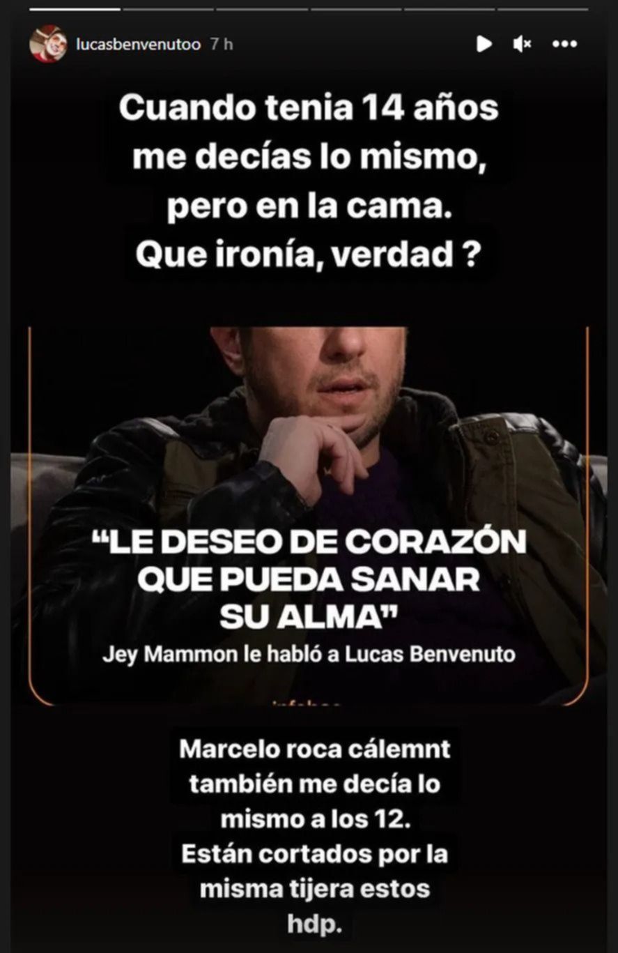 Lucas Benvenuto estalló en las redes mientras escuchaba a Jey Mammon hablar sobre la denuncia de abuso sexual que pesa sobre él y negar una vez más haberlo conocido cuando tenía 14 años. "14, yo no miento", remarcó el joven en una historia en Instagram.