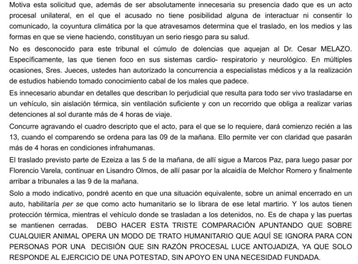 En esa nota, Melazzo sostiene: “Por cuestiones de índole personal, físicas y psíquicas no deseo presenciar la lectura del veredicto (…). Deseo dejar constancia de lo agobiante que resulta para mi salud, por mi estado las altas temperaturas que se deben soportar a lo largo del traslado al Tribunal. No posee ventilación ni menos aire acondicionado, las latas superan los 50 grados centígrados”.