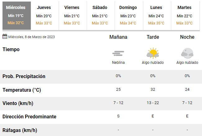 Con vientos leves a moderados rotando del sur al este, el tercero de los días de la semana transcurrirá además con un cielo mayormente despejado y sin contratiempos, pero todavía con "alerta roja" por las altísimas temperaturas.