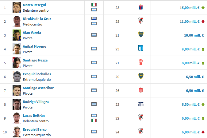 Recientemente, el sitio publicó una lista de los futbolistas más valiosos de la Argentina, cotizados en millones de euros; y el podio lo ocupan Alan Varela (10 millones de euros) en tercer lugar, Nicolás de la Cruz (11 millones) segundo y el propio Retegui en la cima (16 millones).
