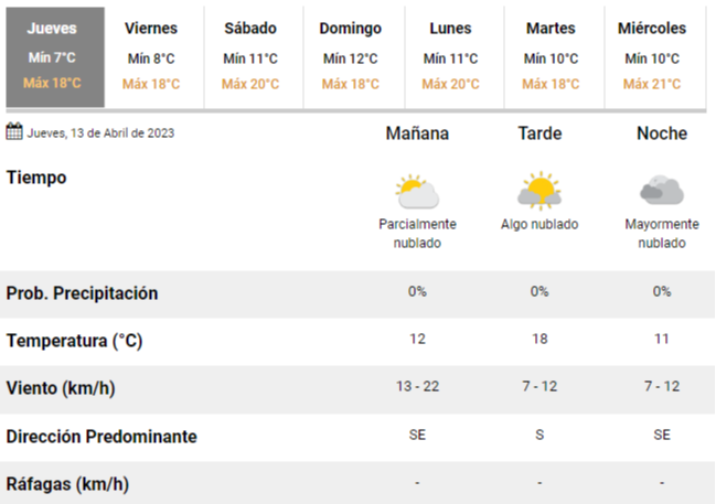 Para esta jornada se espera una máxima de 18°C, cielo algo nublado y una humedad del 91%, mientras el viento sopla desde el sur y el sudeste a a una velocidad de entre 7 y 22 km/h.