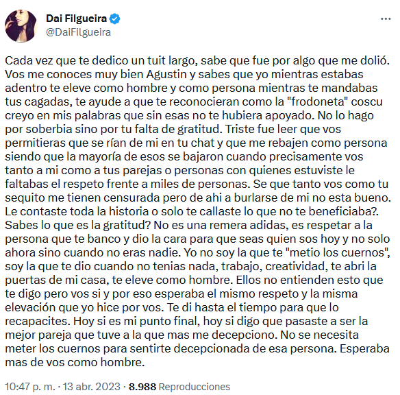 "Cada vez que te dedico un tuit largo, sabé que fue por algo que me dolió. Vos me conocés muy bien, Agustín, y sabés que yo mientras estabas adentro te elevé como hombre y como persona mientras te mandabas tus cagadas", comenzó la joven en un tweet que generó repercusión en las redes.