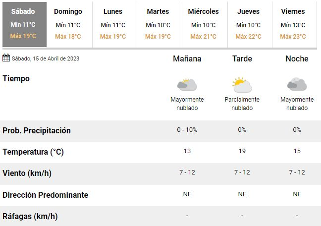 Los expertos del SMN esperan dos días de descanso con un clima cambiante en la región y poca amplitud térmica, con temperaturas oscilando entre 11 y 19°C en toda la región. De acuerdo con sus previsiones, ambas jornadas transcurrirán con un cielo mayormente cubierto de nubes y la amenaza latente de las lluvias sobre el cierre del domingo.