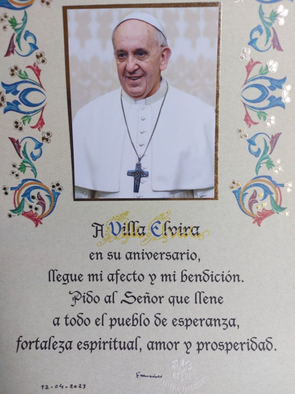 En el texto dice: "A Villa Elvira en su aniversario, llegue mi afecto y mi bendición. Pido al Señor que llene a todo el pueblo de esperanza, fortaleza espiritual, amor y prosperidad".