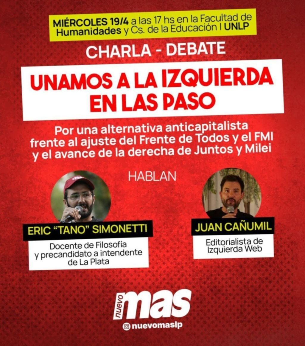 Este miércoles, desde las 17, el Nuevo MAS La Plata convoca a una charla debate titulada "Unamos a la izquierda en las PASO. ¡Por una alternativa anticapitalista unificada, frente al ajuste del Frente de Todos, y el avance de la derecha de Juntos y Milei!", que será conducida por el dirigente Eric "Tano" Simonetti.