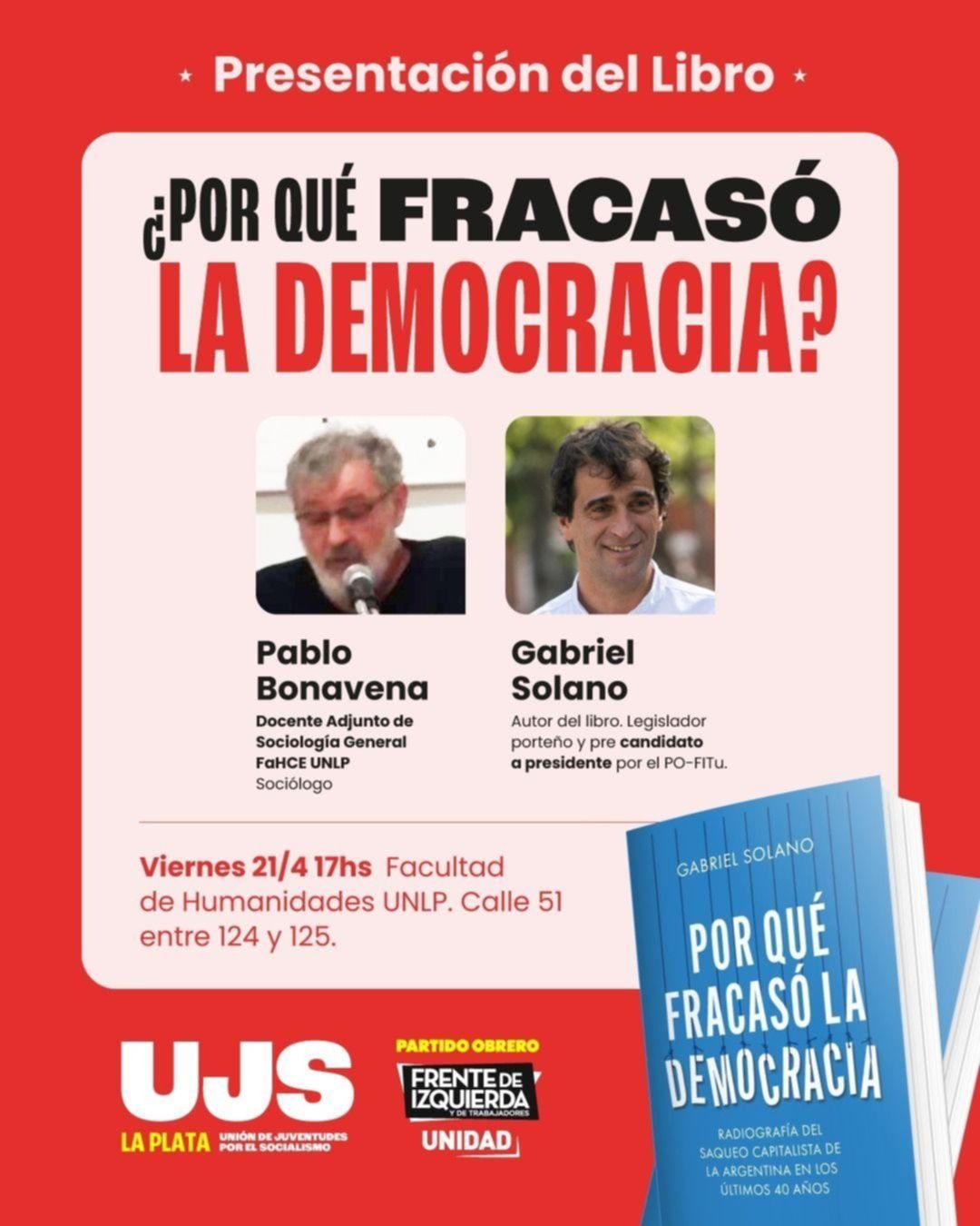 El dirigente del Partido Obrero, Gabriel Solano, visitará este viernes la ciudad de La Plata para presentar su libro “Por qué fracasó la democracia”. El encuentro será en la Facultad de Humanidades de la UNLP a las 17.
