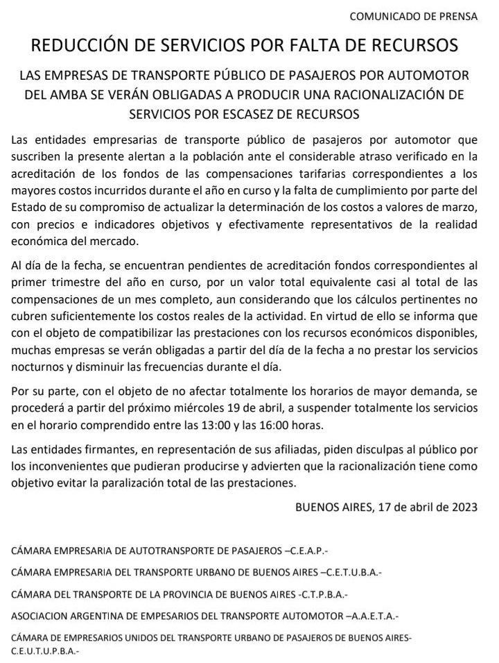 La protesta la encabezan la Cámara Empresaria De Autotransporte de Pasajeros (CEAP), Cámara Empresaria del Transporte Urbano de Buenos Aires (CETUBA), Cámara del Transporte de la Provincia de Buenos Aires (CTPBA), Asociación Argentina de Empresarios del Transporte Automotor (AAETA) y Cámara de Empresarios Unidos del Transporte Urbano de Pasajeros de Buenos Aires (CEUTUPBA), que emitieron esta misma tarde un duro comunicado de prensa para dar a conocer la medida e insistieron que la suspensión de los servicios se llevará a cabo "con el objeto de compatibilizar las prestaciones con los recursos económicos disponibles".