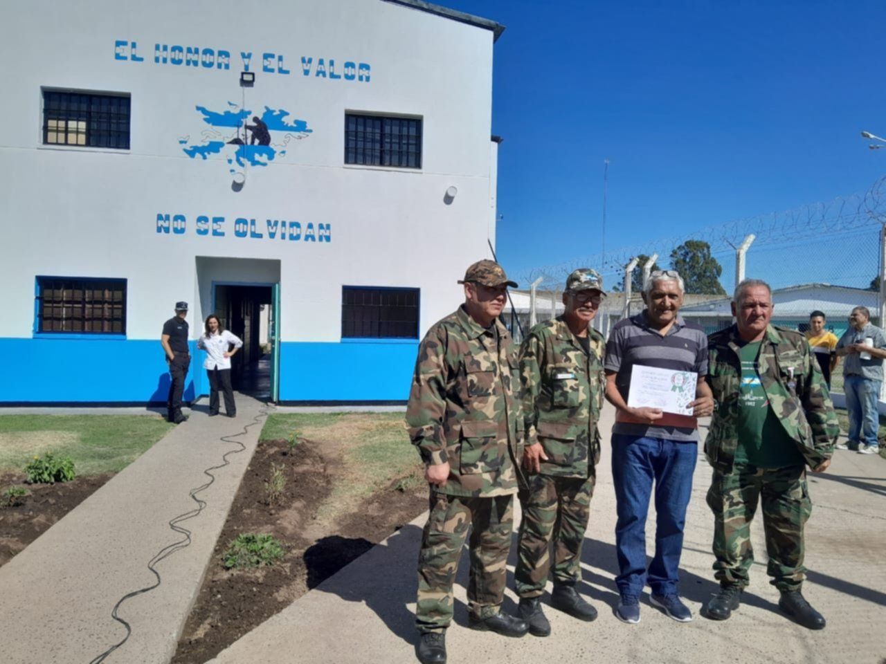 "El honor y el valor no se olvidan", esa es la frase del mural inaugurado junto al contorno de las Islas Malvinas pintadas de celeste y blanco en la fachada de la sede de la sección de Asistencia y Tratamiento ubicada dentro de la Unidad 41. Los invitados agradecieron el homenaje y se interesaron por la propuesta y el interés que el personal penitenciario y los privados de libertad demostraron por la causa de la que ellos fueron protagonistas hace tantos años.