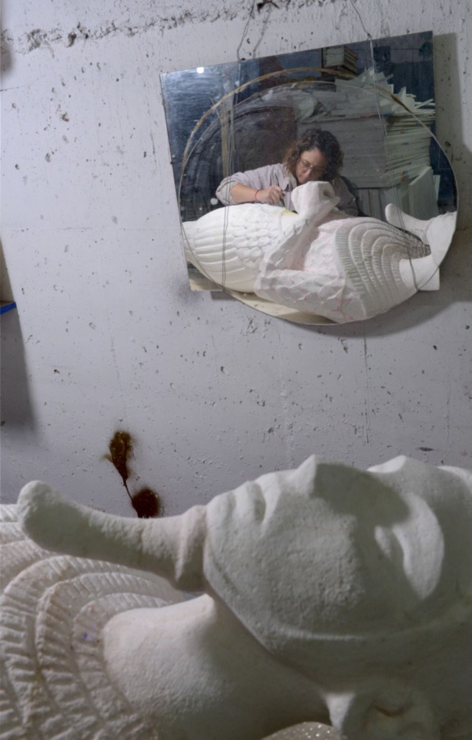 "Estamos trabajando Aída, preparando todo lo que es la parte de volumen. Estamos haciendo tronos en la parte de carpintería, lanzas con sus cabezales y cetros. La parte de escultura está haciendo la imagen del faraón que ya está terminada. En la parte de utilería están haciendo todos objetos de mano, forrando, las esculturas ya están terminadas. Después en la parte pintura, se dan pátinas, imitando distintas texturas o superficies. Y también está la tapicería, que están haciendo unos muñequitos egipcios de tela que van en una barca sagrada que ya tallaron los escultores", contó Gabriel Cercato, jefe interino del Taller de Realización de Utilería y Escultura, que tiene a cargo a un total de 19 personas.