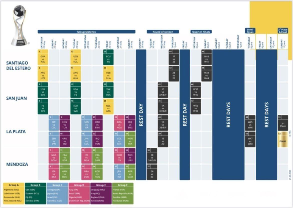 El 8 de junio el Diego Armando Maradona será el escenario para las semifinales y unos días más tarde, el 11, será el turno del partido por el tercer y cuarto puesto y, finalmente, la gran final del Mundial Sub 20.