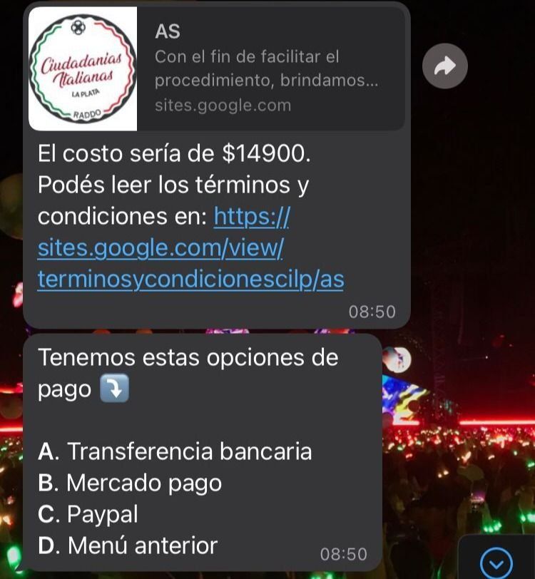 El platense compartió las capturas de los intercambios de chat con la gestoría en el que se explicitan los importes para los trámites y detallan que el servicio que prestan es legal y se basa en el uso de técnicos que son "externos al Consulado" y cuentan con equipamiento con mayor capacidad para gestionar los turnos online, lo cual es el gran filtro de todos los trámites que se realizan en la sede diplomática. Se interpreta de ello que tienen varias computadoras con servidores de Internet más veloz, trabajando al mismo tiempo para acceder a los turnos.