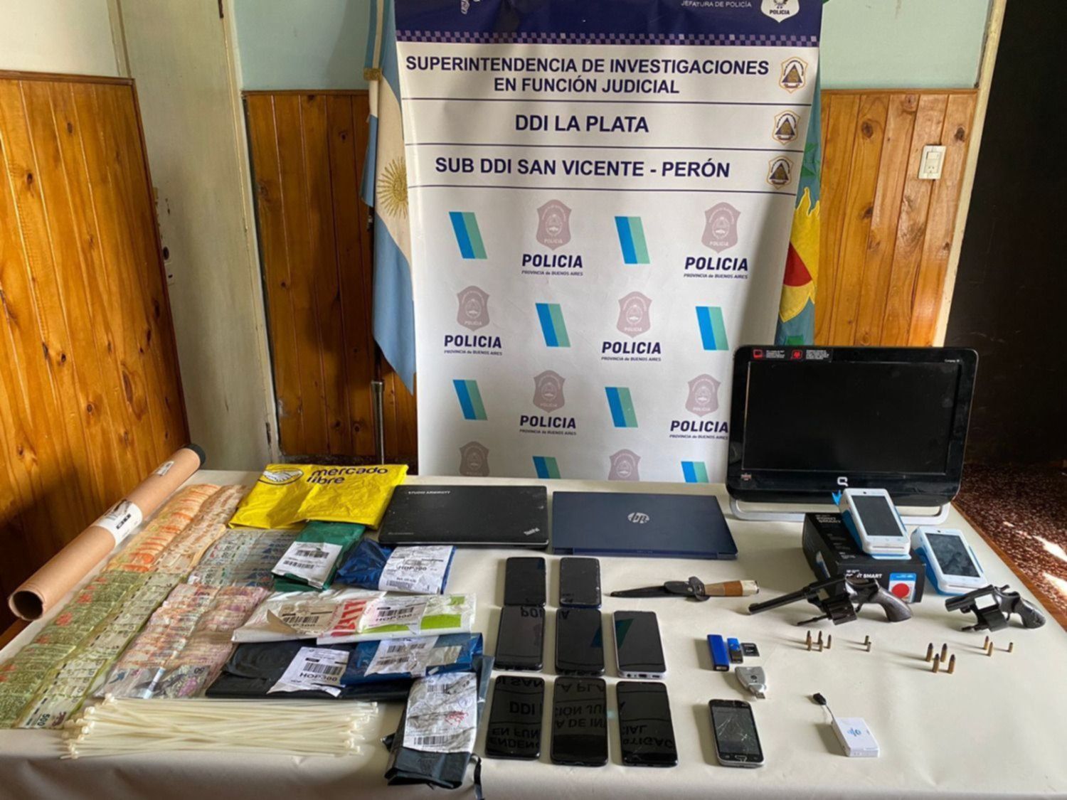 En las propiedades se encontraron ocho envoltorios de rotulo de entrega de Mercado Libre, tres posnet de Mercado Pago, nueve celulares, pendrives, varias computadoras, $75.000 y dos revólveres calibre 22, uno de ellos con dos vainas servidas en el tambor.