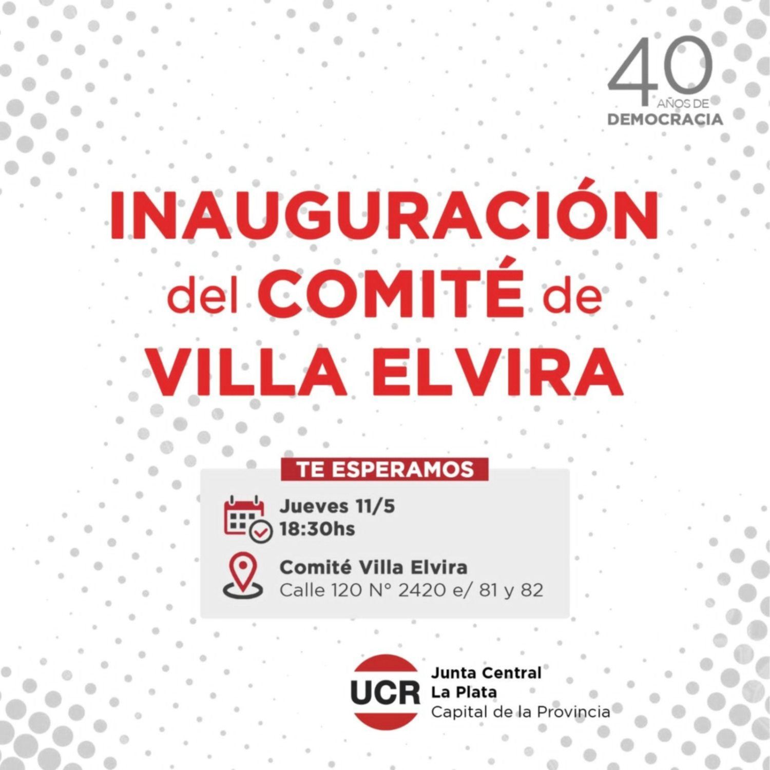 La Junta Central de la Unión Cívica Radical de La Plata anunció que este jueves 11 de mayo a las 18.30, abrirá un nuevo comité en 120 N° 2520 entre 81 y 82 del barrio de Villa Elvira. El espacio estará a cargo de Agustín González.