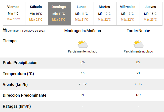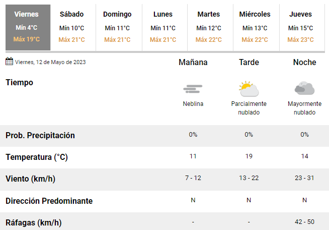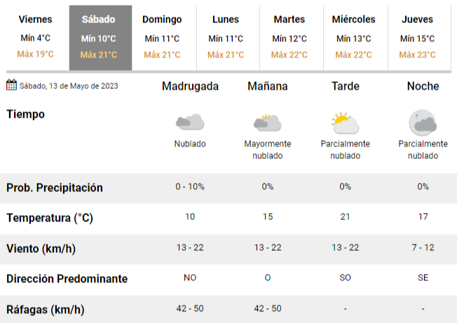 Según las previsiones del SMN, para el sábado y el domingo se esperan temperaturas de entre 10 y 21°C. Los especialistas esperan un fin de semana con buenas condiciones climáticas, aunque un cielo mayormente cubierto y mucho viento en el inicio del primer día libre.