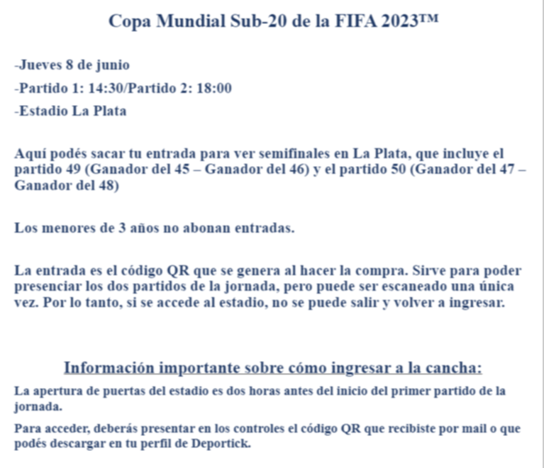 "La entrada es el código QR que se genera al hacer la compra. Sirve para poder presenciar los dos partidos de la jornada, pero puede ser escaneado una única vez. Por lo tanto, si se accede al estadio, no se puede salir y volver a ingresar", anticiparon los organizadores del evento.