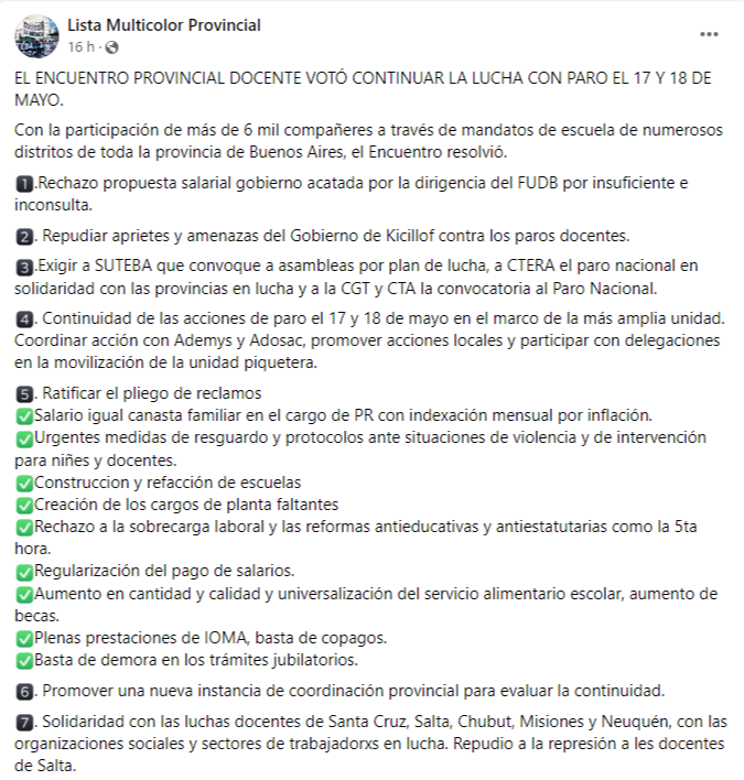 Según expresaron, los docentes manifestaron su "rechazo" a la propuesta salarial que el gobierno de Axel Kicillof le presentó en el marco del último encuentro paritario a los representantes del Frente de Unidad Docente Bonaerense (FUDB), que además del SUTEBA también reúne a la Asociación del Magisterio de Enseñanza Técnica (AMET), la Federación de Educadores Bonaerenses (FEB), el Sindicato Argentino de Docentes Privados (SADOP) y la Unión de Docentes de la Provincia de Buenos Aires (UDOCBA). Además, destacaron su repudio a los "aprietes y amenazas" que habrían recibido por parte de las autoridades provinciales y enumeraron una larga lista de precisos reclamos: