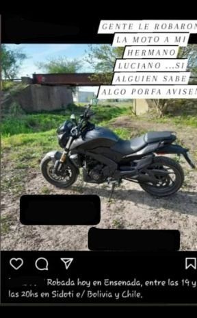 Según trascendió, la moto -marca Bajaj, sin dominio- en la que viajaban los sospechosos había sido robada el 8 de mayo en calle Sidoti entre Bolivia y Chile. Además explicaron que hay otros dos menores que están siendo buscados, acusados de formar parte de una banda dedicada al robo y desguace de motos.