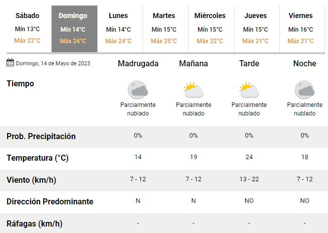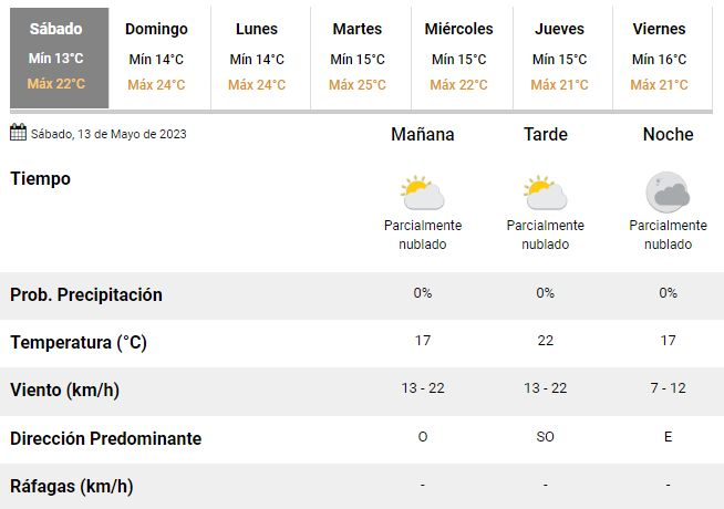Según prevén los meteorólogos argentinos, a lo largo de este sábado la temperatura oscilará entre 13 y 22°C, acompañada de un cielo solo parcialmente nublado y vientos leves a moderados rotando del oeste, al sudoeste y finalmente al este sobre el cierre de la jornada.