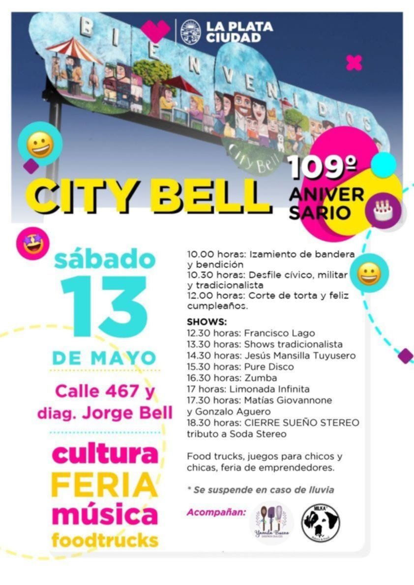 Los festejos por el aniversario 109º de City Bell estarán conformados también por clases de zumba, el espectáculo del grupo Limonada Infinita, food trucks con propuestas gastronómicas para todos los gustos, una gran variedad de juegos para el disfrute de los más chicos y feria de emprendedores.