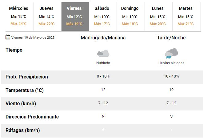 En este marco, en el SMN advirtieron que las buenas condiciones de tiempo llegarían a su fin a medida que avance el último día de la semana, para cuando se esperan crecientes chances de lluvias y chaparrones aislados, fundamentalmente pasado el mediodía de la jornada.